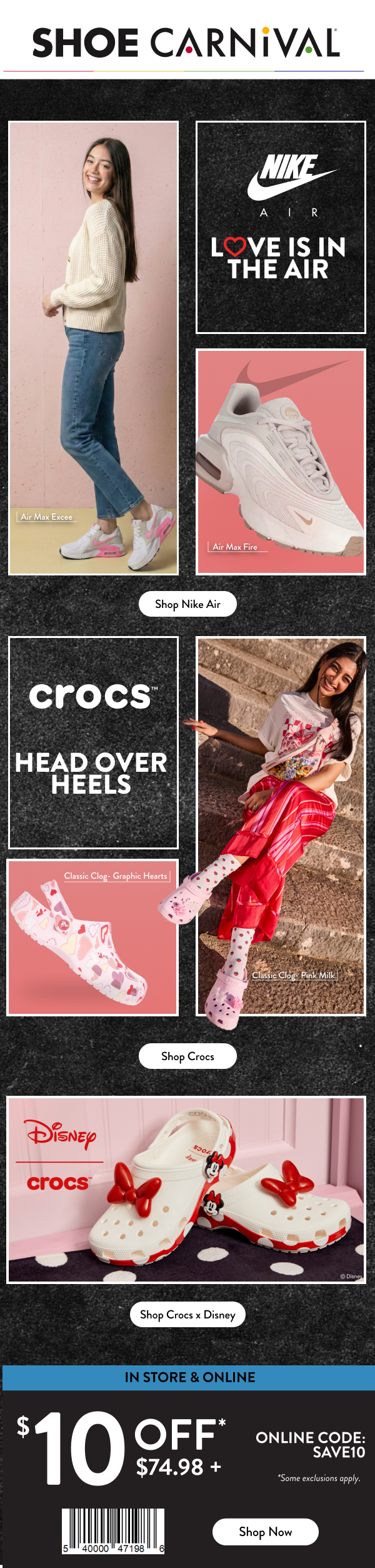 With my time at Shoe Carnival had the privilege to work with one of America’s top family shoe retailers. I was part of a team that lead the design and production of marketing emails, homepage layouts, social media posts and in-store animated promo screens. We worked with major athletic and life style brands like Nike, Adidas, Crocs, Heydude, and Birkenstock.